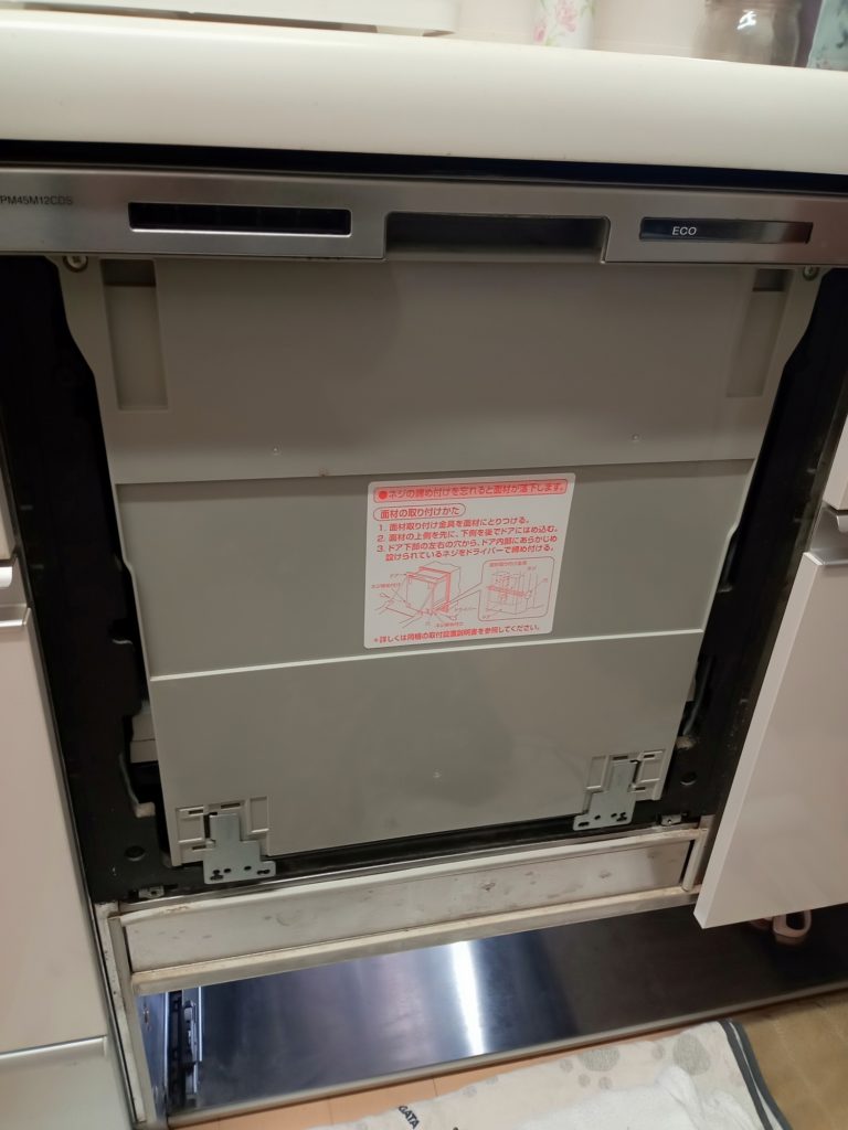 この食洗機は全面の化粧パネルがキッチンと同じ素材を使っているので、化粧パネルを取り外して最後に再利用します。
